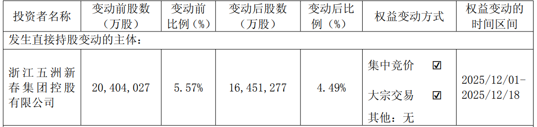 中国经济网北京12月22日讯 五洲新泉(603667.SH)12月19日晚间披露提示性公告,持股5%以上股东权益变动达到1%大关。 12月19日,公司收到五洲控股通知,控股股东共同行动方浙江五洲新春集团控股有限公司(以下简称“五洲控股”)于2025年12月1日至2025年12月18日通过集中,通过竞价及大宗交易方式减持公司股份3,952,750股,占公司总股本的1.08%。控股股东及一致行动人持股比例合计由37.00%下降至35.92%,权益变动达到1%大关。按12月1日至12月18日加权平均五洲新年价50.89元计算,五洲控股本期减持为e折合人民币约2.01亿元。 2025年10月11日,公司披露《关于五洲新春控股股东一致行动人、董事、高级管理人员减持股份计划的公告》。为改善财务状况,降低经营风险,浙江五洲新春集团控股有限公司(以下简称“五洲控股”)拟于交易日起5日内,通过集中竞价等方式减持所持公司股份总数不超过1000万股,占公司总股本的2.73%。自公告之日起,自2025年11月3日至11月14日, 2025年,五洲控股通过集中竞价减持公司股份2,956,160股,占公司总股本的0.81%,控股股东及一致行动人持股比例由37.81%下降至37.00%。11月3日至11月14日八个月均价为46.29元/股,五洲控股本次减持约1.37亿元。根据证监会发〔2019〕2568号文件批复,并经上海证券交易所同意,主承销商兴业证券股份有限公司(以下简称兴业证券)在公司原股东中优先增持本公司。原股东优先配股后的余额(含原股东优先配股的部分)将向社会公众投资者投资。本次发行认购金额不足的部分将由主承销商承销。计算公式为,公开发行可转债330万张,每张面值100元,按面值发行,募集资金总额3.3亿元,承销及保荐费84元。12,500元(不含预付200万元)后募集资金达32,158.75万元,已划入公司监管下的公司工业账户1承销账户。 2020年,扣除与发行可转换公司债券直接相关的额外外部费用1,311.84万元(不含税)后,公司本次募集资金净额为31,688.16万元。上述募集资金到账已经天健会计师事务所(特殊普通合伙)验证,并出具了《验证报告》(天健验[2020]40号)。根据《关于中国证监会核准浙江五洲新春集团股份有限公司非公开发行A股股票的批复》 (证监许可[2022]2136号),公司采用非公开发行方式作为主承销商中信证券股份有限公司(以下简称中信证券)发行4,029股人民币普通股(A股)具体目标。本次发行8,507万股,发行价格为13.40元/股,共募集资金5.4亿元。扣除承销、保荐费用及相应的增值税700万元后,募集资金为5.33亿元,已于2023年7月20日汇入主承销商中信证券股份有限公司资金管理账户。附加费用按相当于公司保荐费用的承销费用征税。中信证券股份有限公司募集资金39.62万元,公司将于2023年7月20日打入公司募集资金管理账户。此外,扣除网印费、账户打印费、前景审核费等与发行权益性证券直接相关的新增免税外部成本217.27万元后,公司本次募集资金净额为53,122.35万元。上述募集资金到位情况已核实经天健会计师事务所(特殊普通合伙)出具了《验资报告》(天健验[2023]380号)。五洲新年上述两轮融资总额达8.7亿元。 2025年10月27日,五洲新泉公布了向特定对象发行A股招股说明书(申请草案)。本次向特定对象发行A股募集资金总额不超过10亿元(含原金额)。扣除发行费用后,募集资金拟投资于嵌入式智能机器人及智能汽车驾驶关键零部件的研发项目及产业化,并增加流动资金。本次发行的保荐机构为中信证券股份有限公司,保荐代表人为郑天宇、杨帆。 12月5日上交所网站更新的评价项目动态显示,五洲新泉股票非公开发行的审核状态已通过。