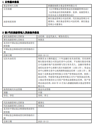 中国经济网北京10月15日电今日,新疆前海联合基金管理有限公司发布公告。原总经理、法定代表人吴玉存因工作安排辞职,原董事长黄伟辞职。邹文清不再履行公司总经理、法定代表人职责。何国岭历任洛阳银行股份有限公司资本运营中心经理、平安银行股份有限公司金融市场产品部承销发行办公室负责人、金融市场事业部经纪业务中心承销发行办公室副经理(主持工作)、销售交易中心机构销售部副总经理 资本运作配给中心(管理工作)。 2025年10月起任国海富兰克林基金管理有限公司资产管理部、第二机构部总经理,华泰宝兴基金管理有限公司专户投资部总经理。