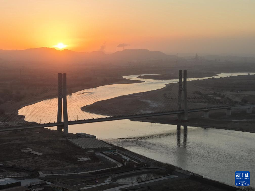 12月23日,宝银高铁乌海黄河大桥拍摄日出。随着晨光开始升起,银装素裹的高铁乌海黄河大桥上闪烁着金色的光芒,一条巨大的钢龙静静地躺在母亲河里。当日,宝银高铁全线投入运营。新华社记者 邢光利 摄