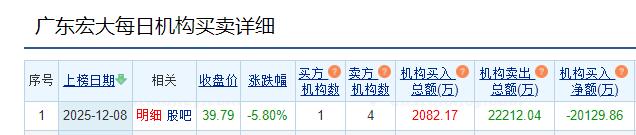 中国经济网北京12月8日电 广东宏达(002683)今日收盘报39.79元,跌幅5.80%。龙虎榜数据显示,买入广东宏大金额最大的前五名投资者中,有一家机构独占席位;卖出广东宏大金额最大的前五名投资者中,有四家机构独占席位。据统计,广东宏大今日卖出的机构席位净值为20129.86万元。